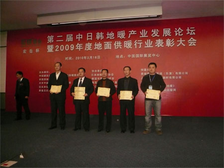 最后,会议进入地面供暖行业年度表彰颁奖仪式环节,秦皇岛好博塑胶有限公司凭借近年来的稳固发展以及在地暖行业的突出贡献被评选为“2009年度地暖行业先进集体”,张思良和王明科当选为“2009年度地暖行业先进个人”。本次会议的胜利召开及以上荣誉的获得,充分证明了好博公司在全国地暖行业的优势地位,同时也为公司的进一步发展打下了坚实的基础。