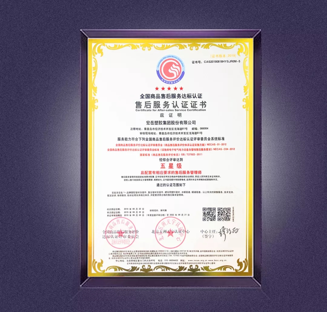 8月22日,好博塑胶集团股份有限公司通过全国商品售后服务达标认证,获得五星级售后服务认证证书。