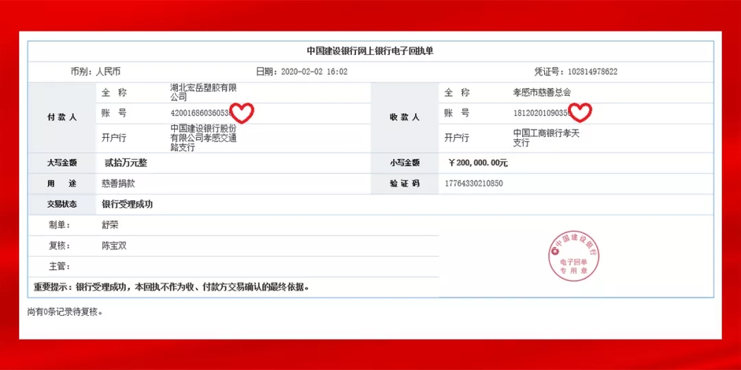 2020年初新型冠状病毒疫情肆虐华中大地,湖北好博塑胶有限公司所在地孝感市是重灾区之一。好博集团心系疫区,多方联络始终无法购置到疫区最急需的防疫物资,经与慈善机构沟通,遂以捐款的形式为社会和政府以尽绵薄之力。当日上述善款已汇入孝感市慈善总会工行孝天支行账户内。