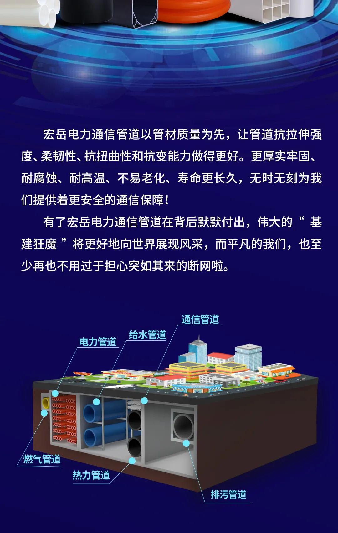 好博电力通信管道以管材质量为先,让管道抗拉伸强度、柔韧性、抗扭曲性和抗变能力做的更好。更厚实牢固、耐腐蚀、耐高温、不易老化、寿命更长久,无时无刻为好博提供着更安全的通信保障!